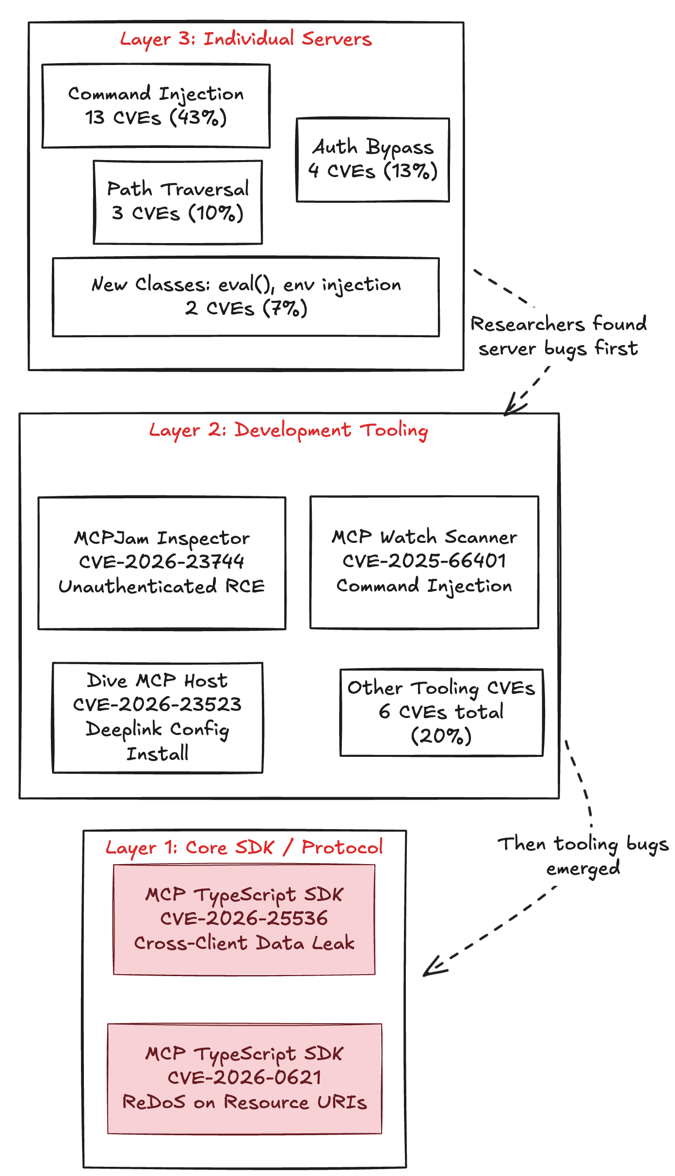 Between January and February 2026, security researchers documented 30 CVEs against MCP servers and related infrastructure. The breakdown tells a story about the ecosystem’s maturity: